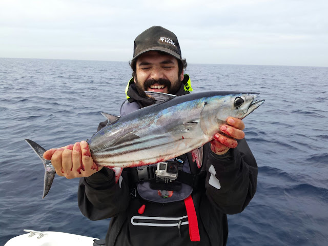 Os sargos teimavam em não aparecer, e por isso ,decidimos rumar mais para sul para tentar outro pesqueiro. A meio caminho, reparo numa data de pássaros a picar com toda a fezada. Decidimos ir espreitar para ver o que se passava. A sonda não marcava nada, mas o fernezim era tanto que comecámos a lançar uns vinis. Os pássaros começaram a dispersar, e como não tinhamos sentido nada, continuámos o nosso rumo mais para sul. Sem muita esperança, decidi pôr uma amostra e corricar ate ao nosso destino, a esperança era tão pouca que montei a amostra no material de spinning, pois pensava que o corrico não iria demorar muito. E não demorou muito, mas foi a ferrar um peixe. Parecia ser um bom peixe, e á medida que se ia aproximando do barco as suas investidas e corridas começaram a ser mais brutas. Como estava a pescar com 0.18 de multifilamento, e sabia que já estava um bocado roçado das pedras, tive que lhe dar uma certa liberdade, pois o peixe fazia realmente muita força. Quando finalmente conseguimos ver a cor dele, uma azul fluorescente como nunca tinha visto, qual foi o nosso espanto: Era um atum!! Um Bonito, também conhecido como Gaiado ou Skipjack tuna! Pela primeira vez tinha apanhado um atum, e quando menos esperava, pois só tinha saido para tentar apanhar uns sargos...